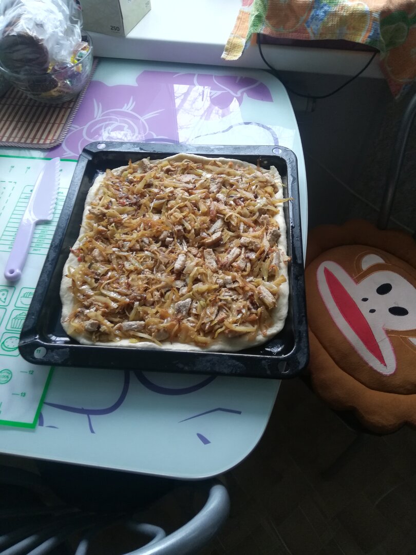 На противень тесто, сверху ровным слоем подготовленную начинку.