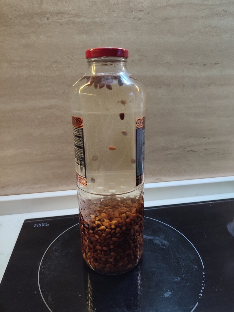 200 гр. зёрен, в литровую ёмкость, доливаю 40-градусной.