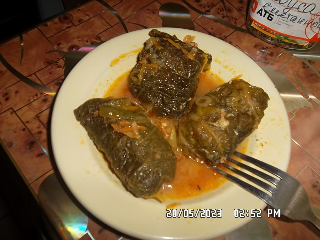 Долма. Нашел баночку законсервированных листьев,завернул фарш из баранины с говядиной,плюс травки... Ничё так .