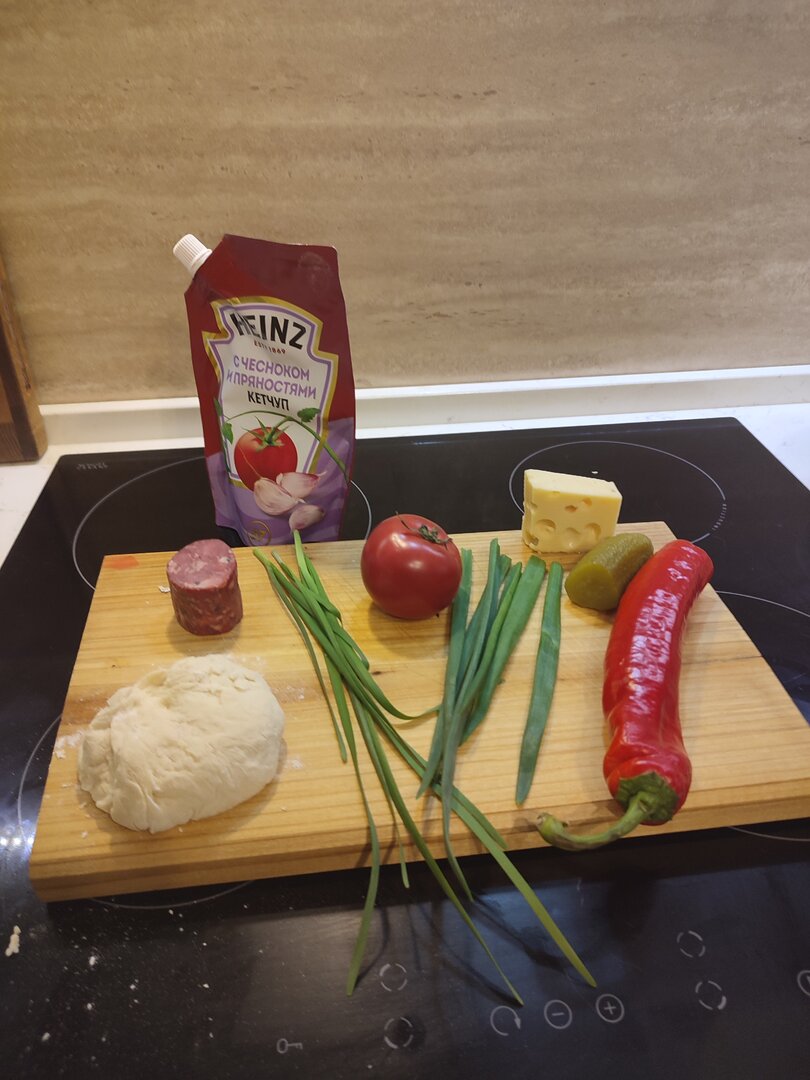 Тесто раскатал, помазал кетчупом, ингридиенты порезал выложил на тесто, сверху тертый сыр.