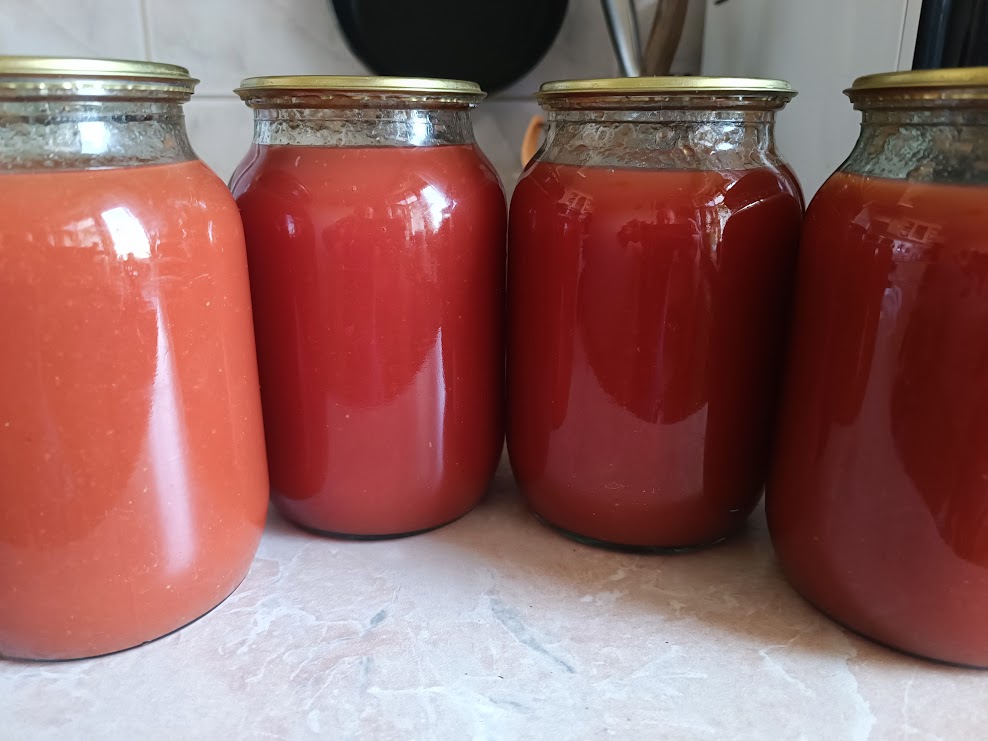 .Тетрапаки еще не освоил? По аналогии с реторт-пакетами.Иду вчера мимо овощного киоска, где обычно беру фрукты-овощи, хозяйка подзывает, говорит что в курсе что я сок томатный себе варю, а у нее тут оказия, при перевозке упали пара ящиков с помидорами типа "бычье сердце" и часть сильно помялась. Забирай, говорит по сорок рублей за кило, пока свежие. Грех не взять...