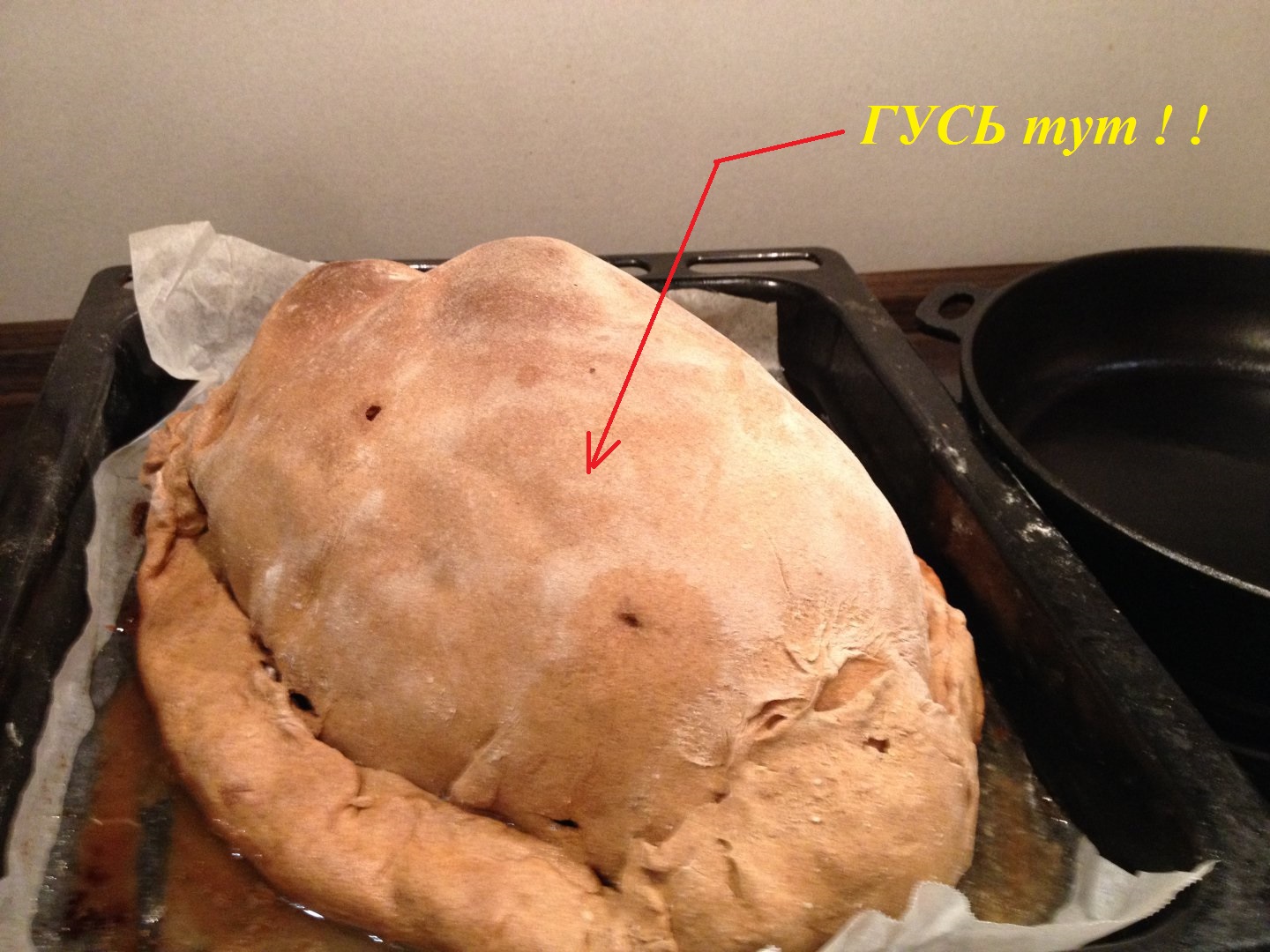 Гусь не пересыхает, тесто пропитывается вытекающим соком, жиром и потом вкушается.