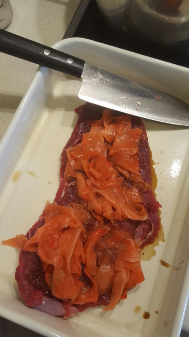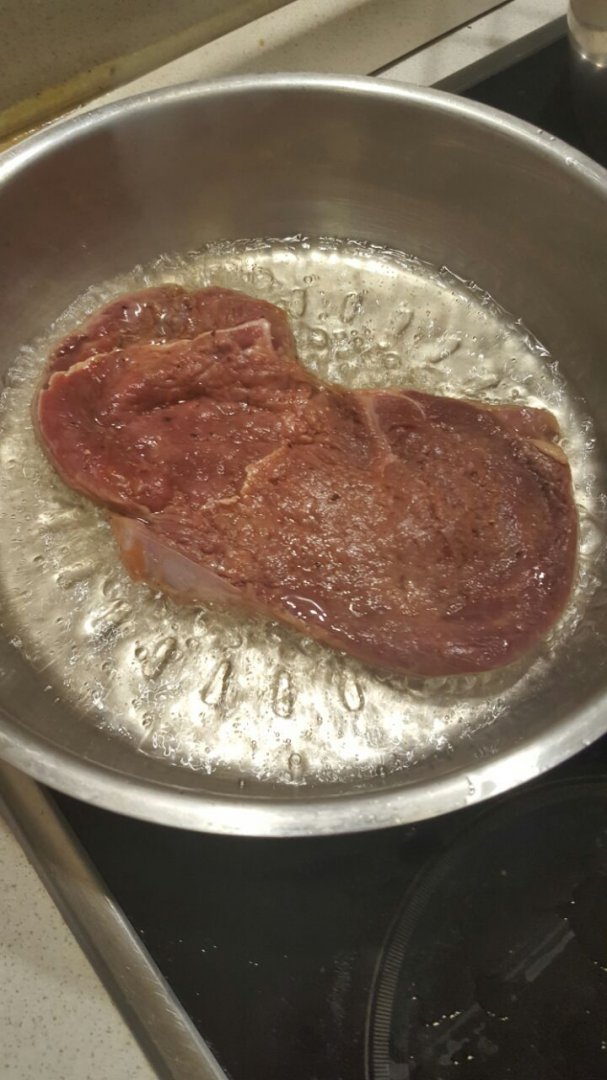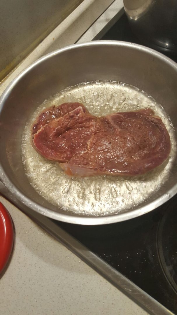 У меня тоже говядина. Не мариновал, только смесь перцев и соль. Средней прожарки.