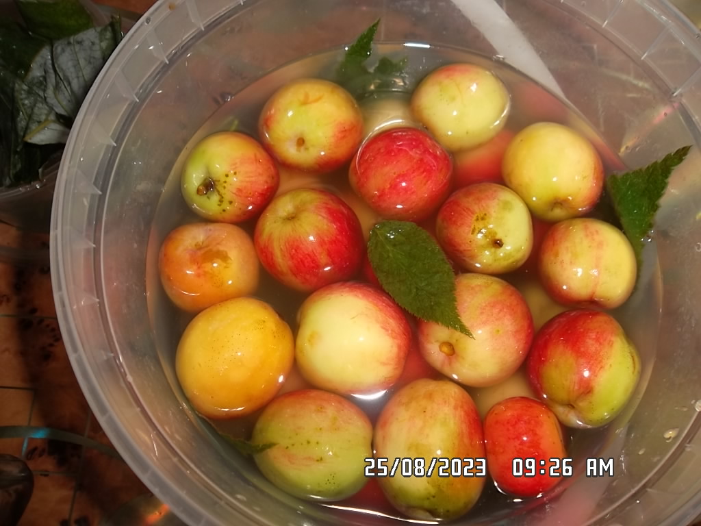 Такие вот яблочки...Красивые,но дубовые-дубовые.Решил их замочить(в прямом смысле слова)Заделал тузлучок,и залил. Продегустировал сегодня. Небо и земля. Мягкие,сочные,сладкие,но еще не резкие.Чз 3 дня ,надеюсь,подквасятся,попробую в кач-ве закусона(праздник мой профессиональный)