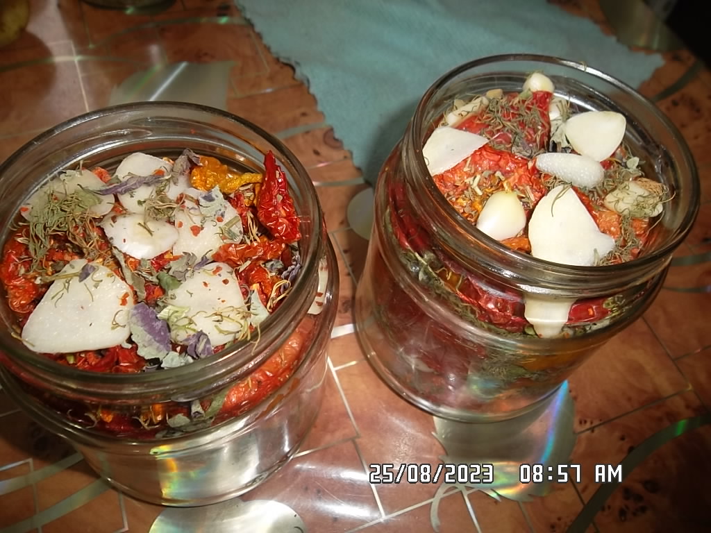 Такие вот яблочки...Красивые,но дубовые-дубовые.Решил их замочить(в прямом смысле слова)Заделал тузлучок,и залил. Продегустировал сегодня. Небо и земля. Мягкие,сочные,сладкие,но еще не резкие.Чз 3 дня ,надеюсь,подквасятся,попробую в кач-ве закусона(праздник мой профессиональный) Посмотреть вложение 378741 Со сранья звоночек звякнул-10 часов помидоры провели в сушилке... Посмотреть вложение 378742 Пришлось готовить... Посмотреть вложение 378743 Помидоры пряные в масле. Много чеснока,много сушеной зелени,перчик,плотно в банки и залить горячим маслом(подсолнечным или оливковым)-разницы во вкусе не нашел. Делаю 3-й раз,оч вкусные. Да,надо чтобы 3- 4 дня постояли в холодильнике.