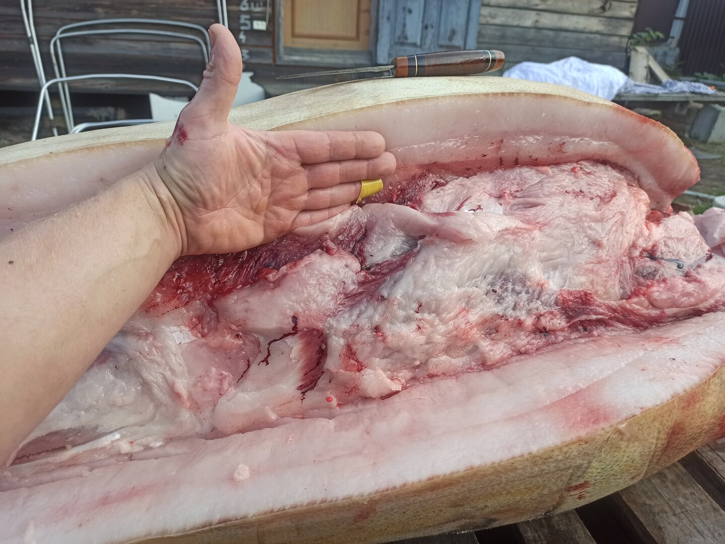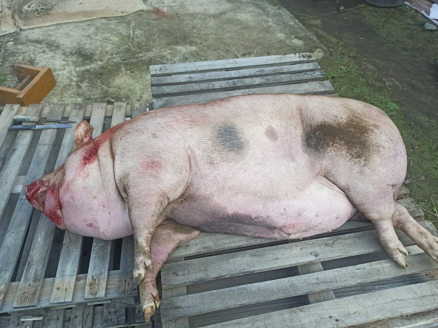 Кабанчик весил живым весом около 350 кг+-, думаю что плюс... Троем тащили минут 40 волоком до разделки, 20 метров...