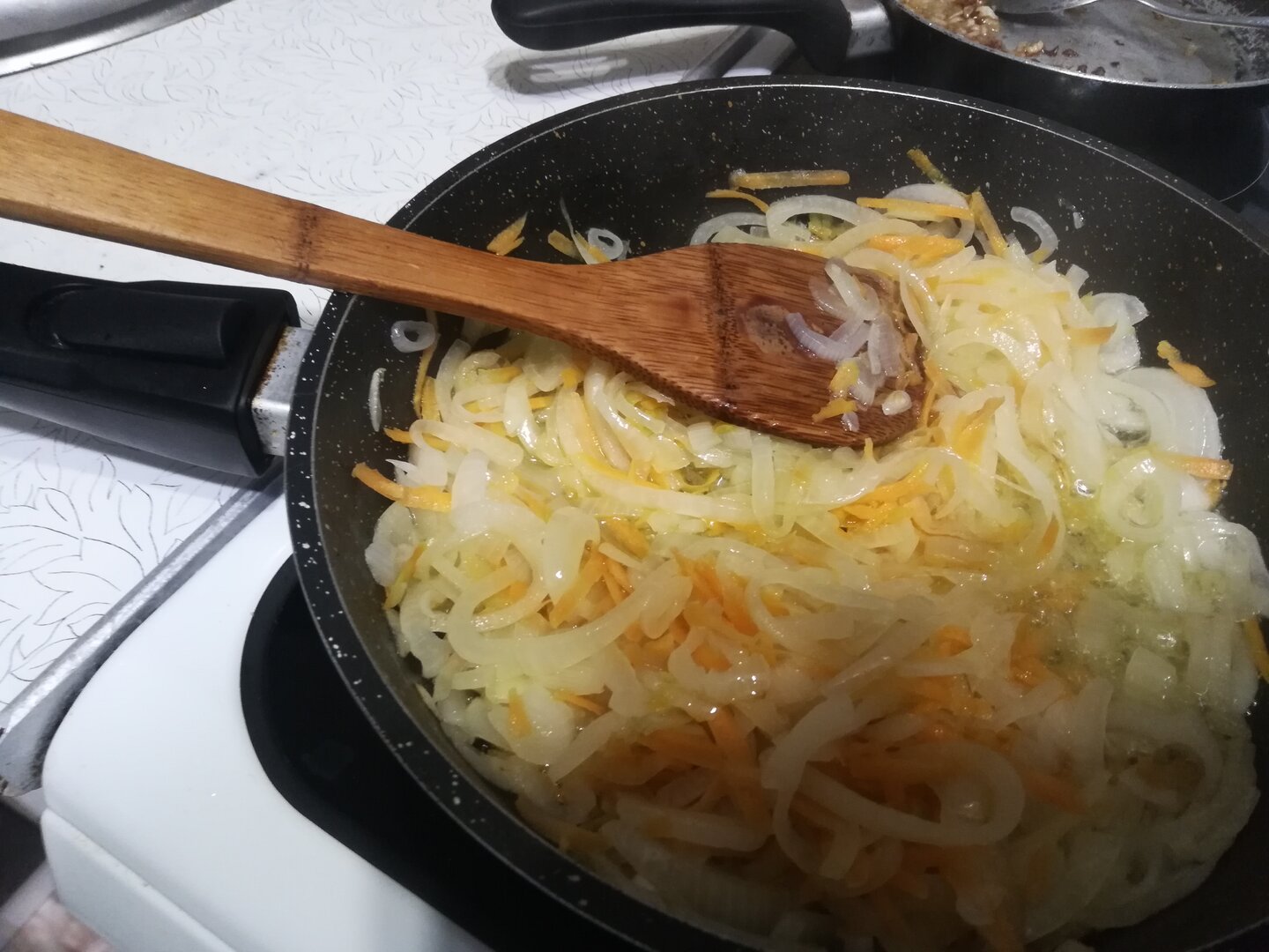 Вечером пришел с работы. Полторы крупных луковицы полукольцами и в сковороду.