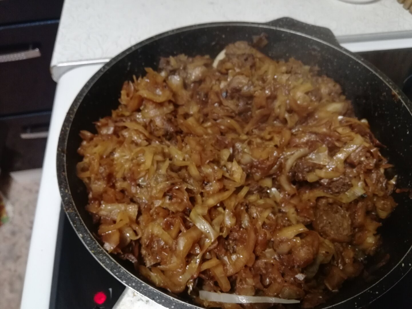 Тушим под крышкой, периодически перемешивая. Минут через 30 весь сок лука и жидкость с мяса выпарилась. Пошла капуста. Капусту не солил и не мял. Мне нужно было не ускорить, а затянуть тушение, что б мясо дошло.