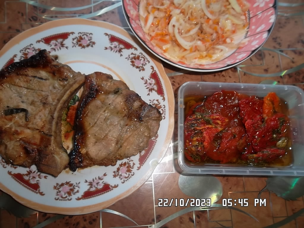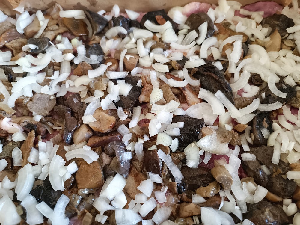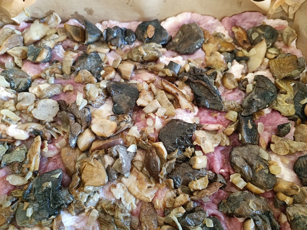Свининку отбил, разложил по противню, чуть присолил, поперчил. Сверху жареных грибочков.