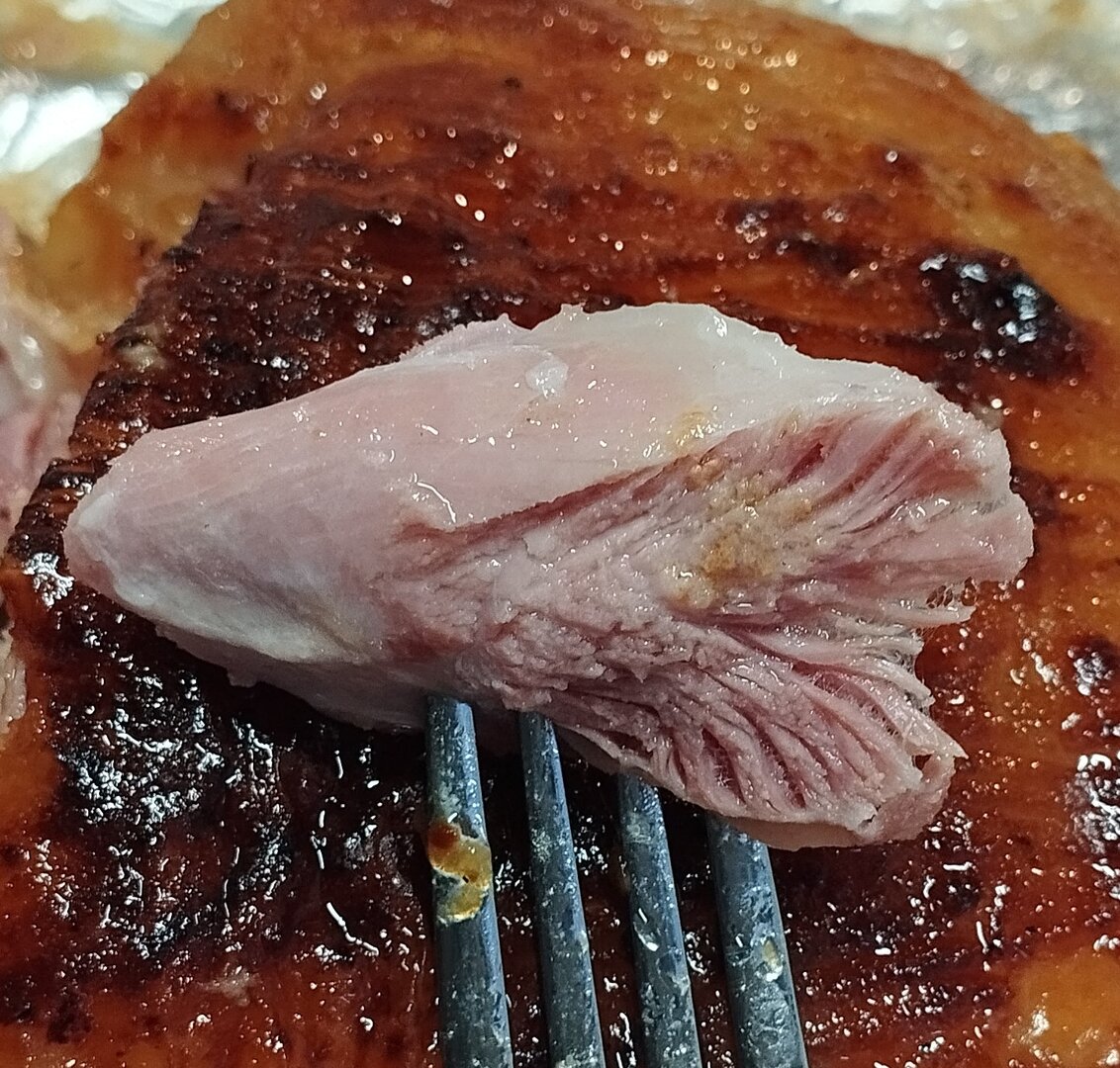 69° на 4 часа оставил вариться. Затем намазал медом с горчицей и в духовке грилем поджарил немного