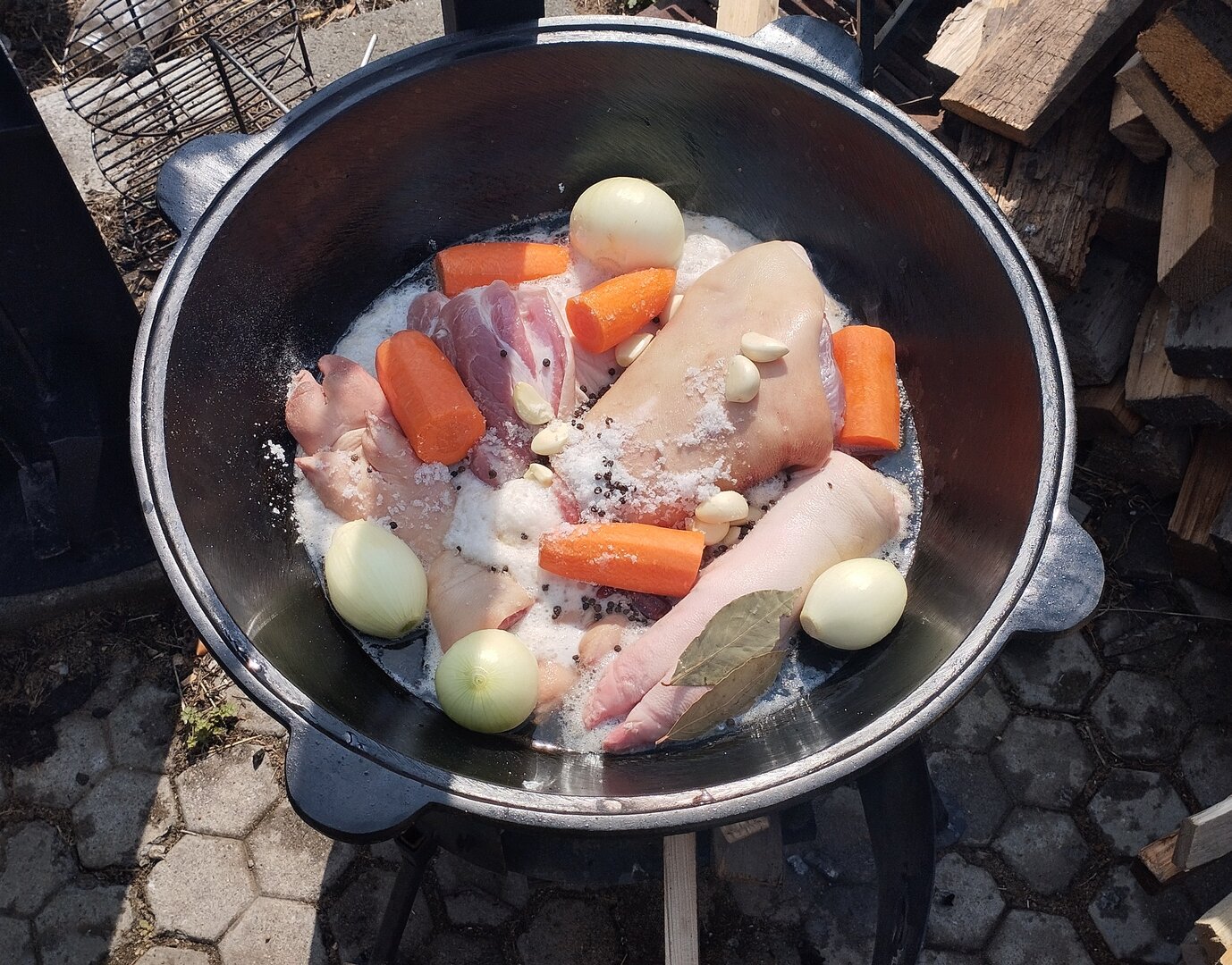 Растопил печь, помыл свинячи ноги и закинул в казан