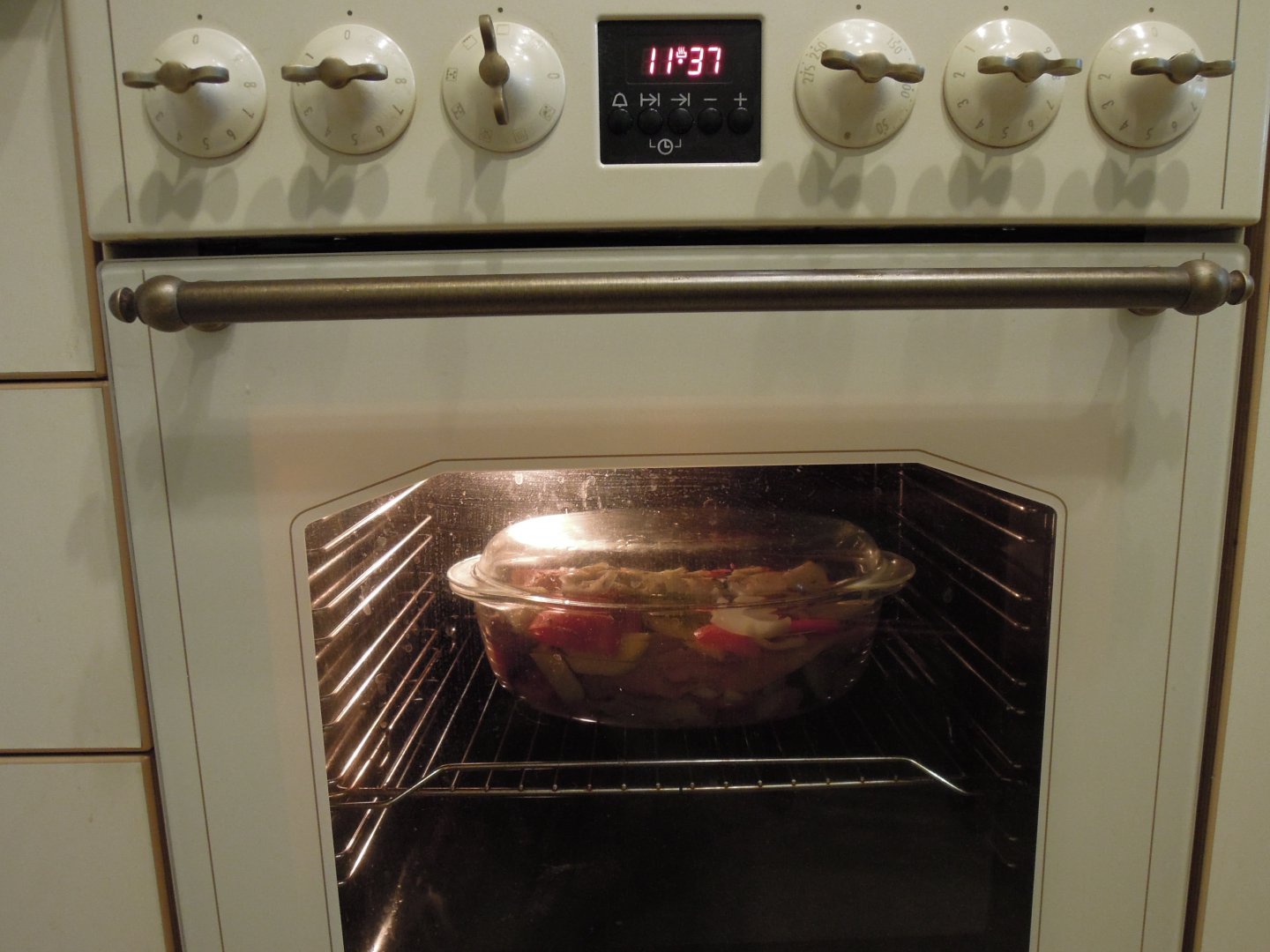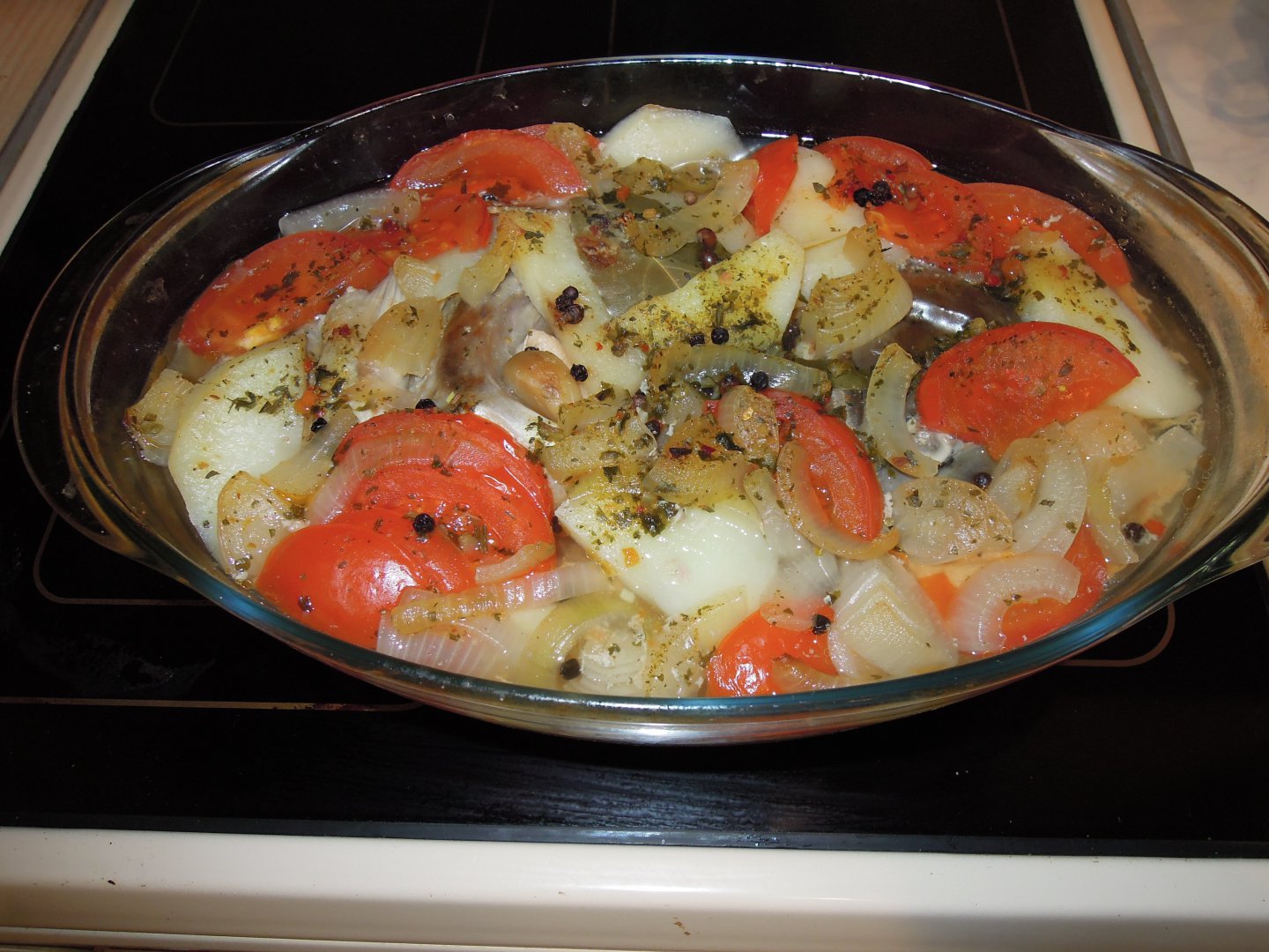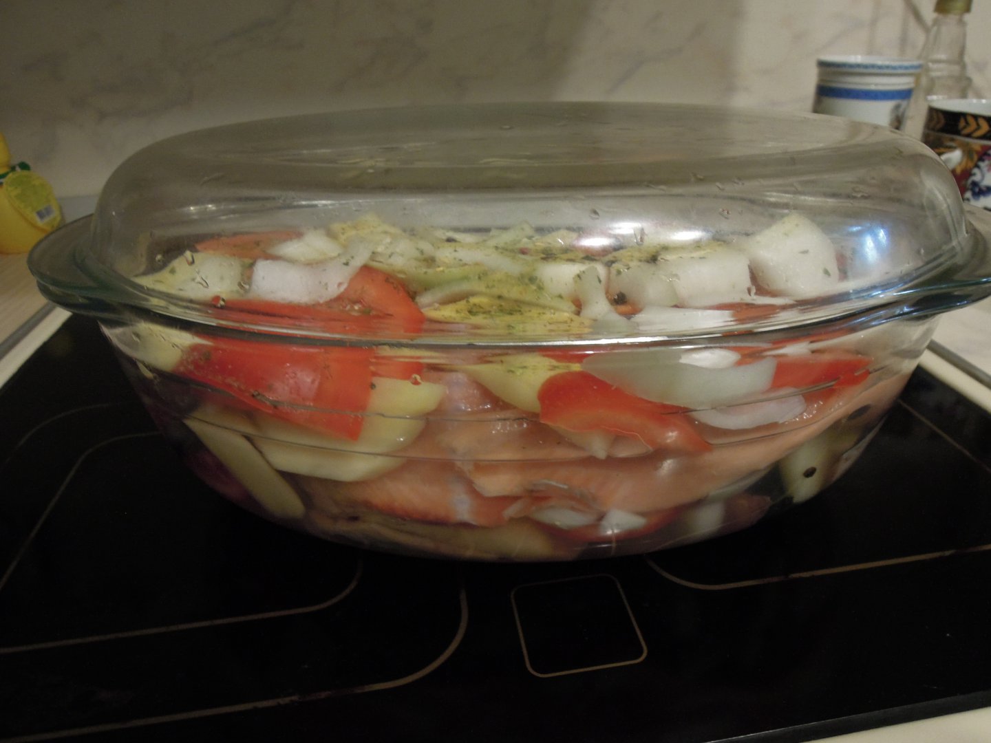 Слоями в посудину, немного воды и в духовку на пару часиков.