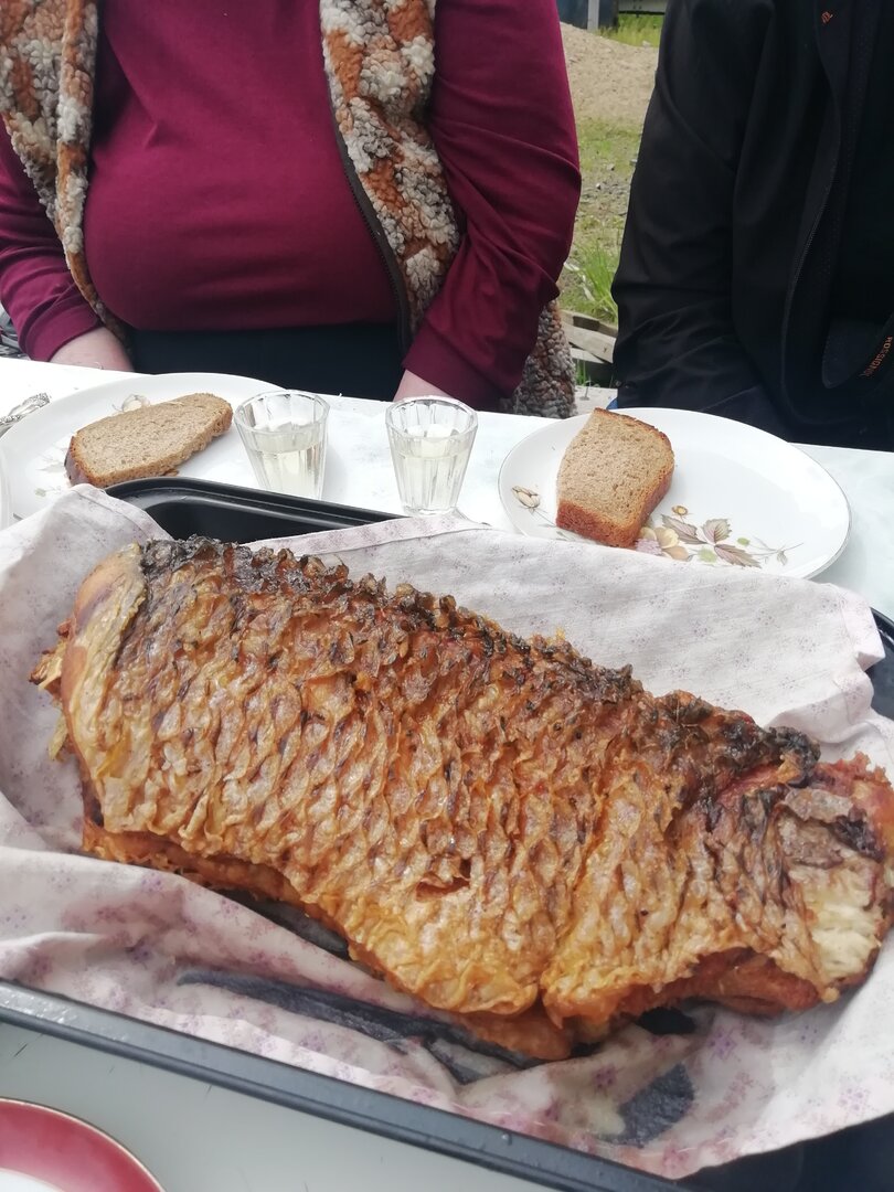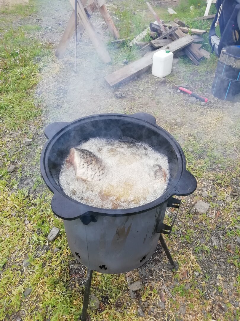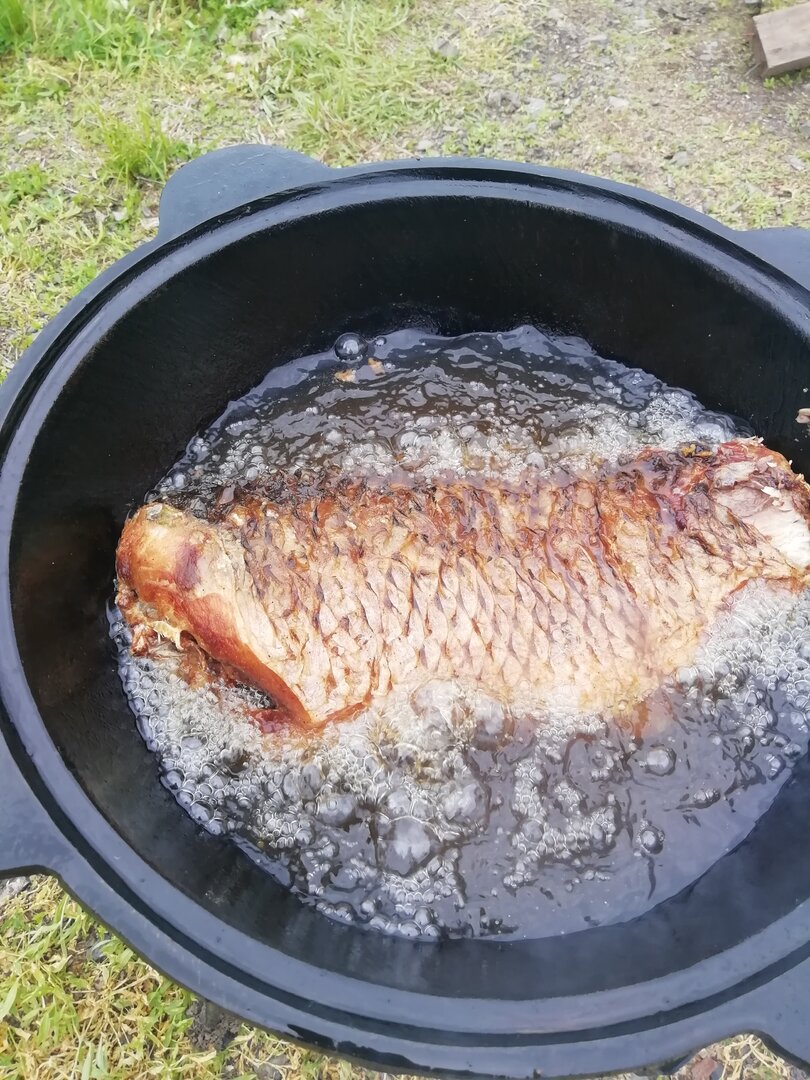 Саша вес сазана был немного за двушку, масла литра 2, если сазан полностью не утоплен как у нас, поливали сверху маслом поварешкой и два раза переворачивали. Если сазан большой можно резать на куски чтобы вошли в казан.Костя, какой вес рыбы? И литраж казана?