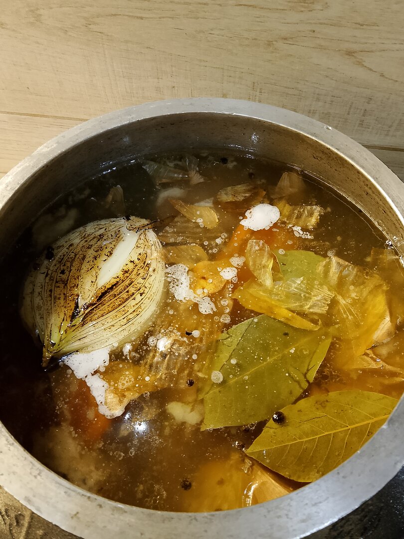 Потом, обожжённые горелочкой половинка лука репчатого и половинка морковки, три лавровых листочка, пригоршня перца горошком. Для цвета луковая шелуха (люблю желтоватый красивый бульон).