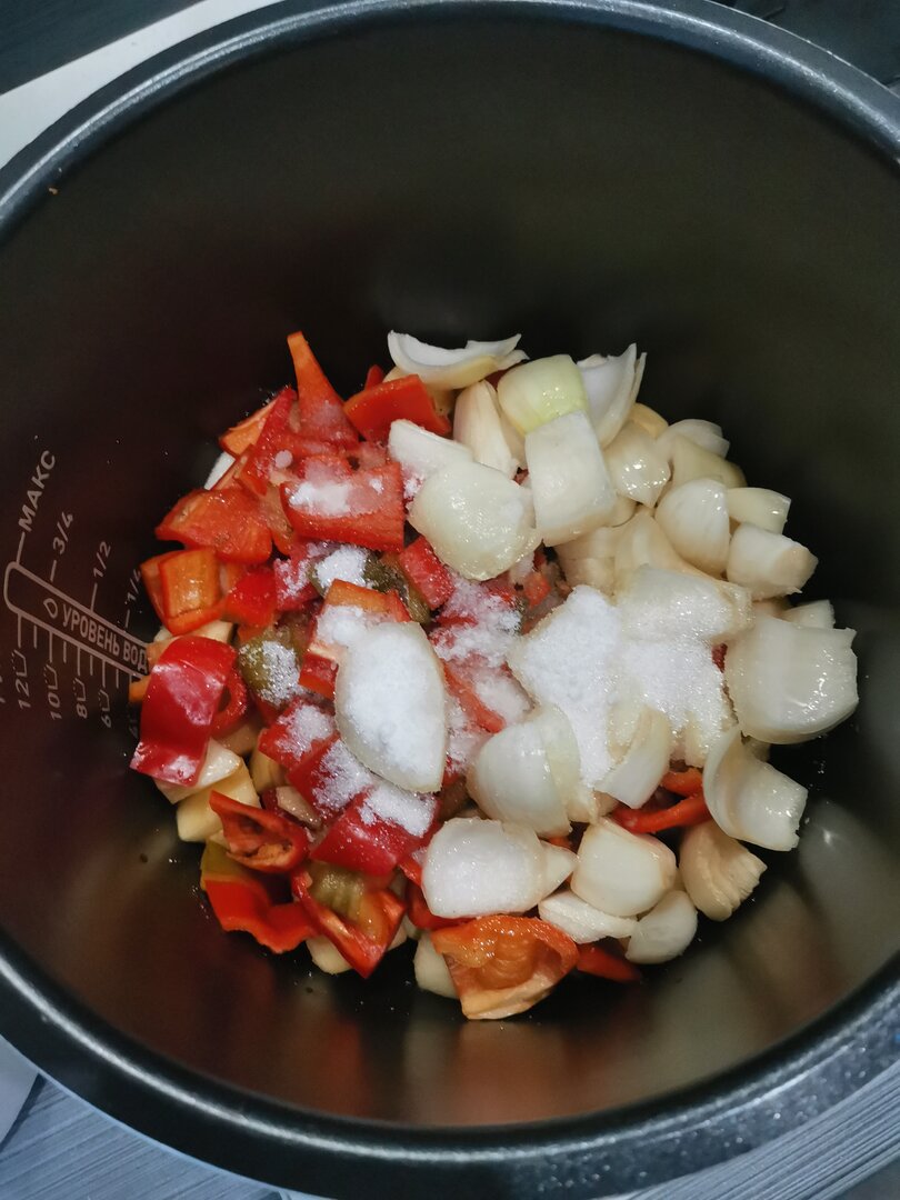 Яблоки, перцы, лук режется и в чашу пароварки, 1 ст л соли 2 ст л сахара.
