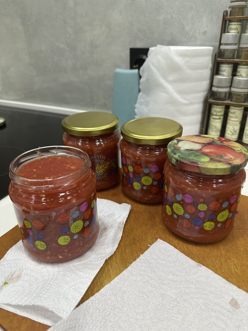 на 2 литра очень спелых перемолотых (на мясорубке) помидор : 3 средних Чьяпоса , 3 средних Каролины Риппер , 2 средних головки чеснока, около 70 грамм перемолотого корня хрена, 4 столовых ложки соли (без горки). Банки и крышки промыть-простерилизовать , горлодер разлить по банкам , закрутить крышки и в холодильник , Сохраняется без брожения до восьми месяцев (больший срок не фиксировали т.к. запасы заканчиваются).