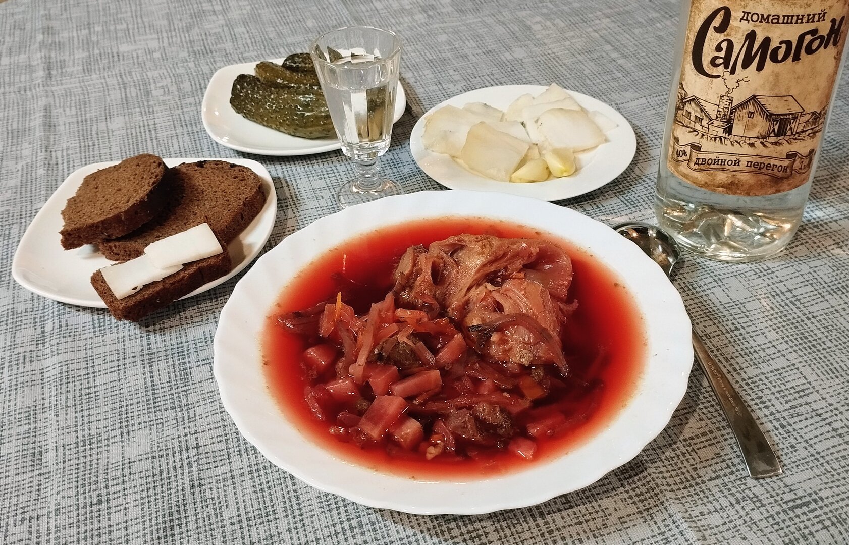 Борщечек с кониной, домашние соленья, сальцо и конечно же усилитель вкуса!