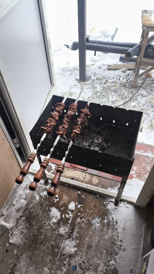 Так как запланированный шашлык из баранины было невозможно отменить, пришлось в контейнере жарить из-за ветра 🌵