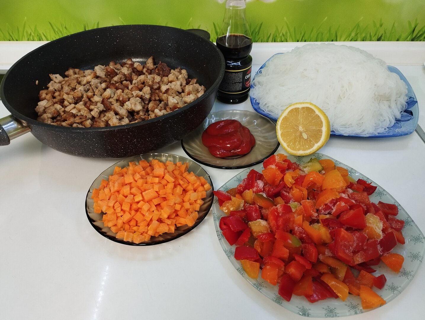 Будет фунчоза с мясом и овощами, лимоном и соевым соусом.
