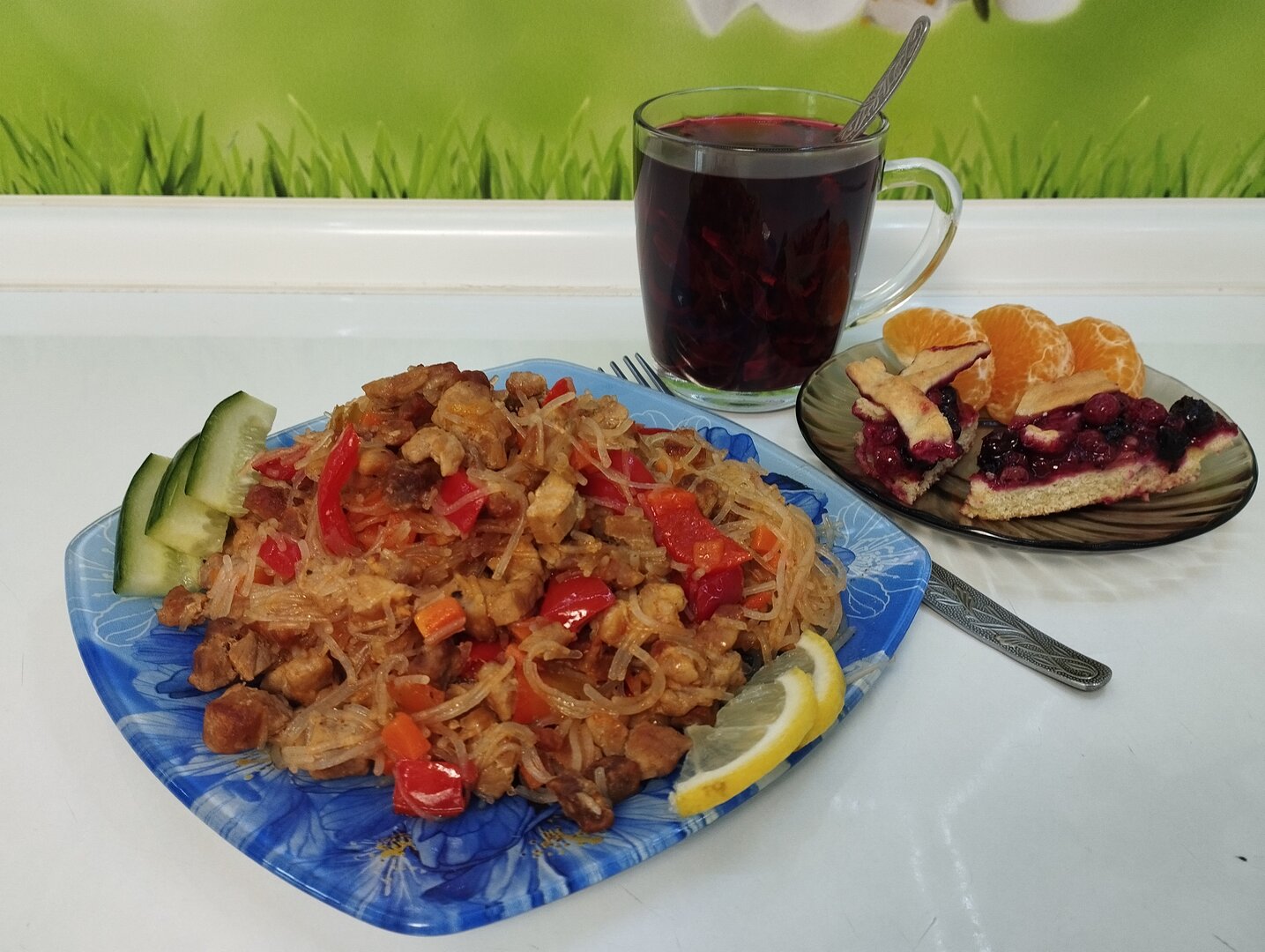 Будет фунчоза с мясом и овощами, лимоном и соевым соусом.