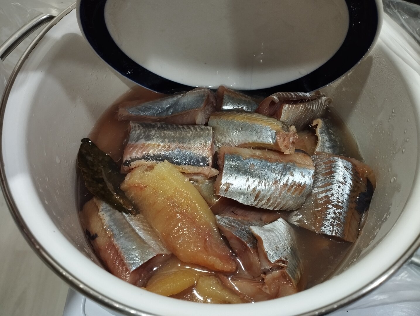 Рыбу очень тщательно чистим, режем на кусочки, укладываем в кастрюлю и заливаем рассолом ( холодным).
