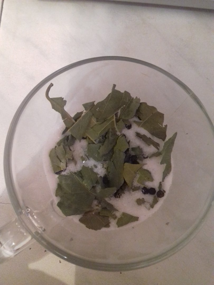 готовим специи-столовая ложка соли и сахара. Перец горошком и лавруха ....