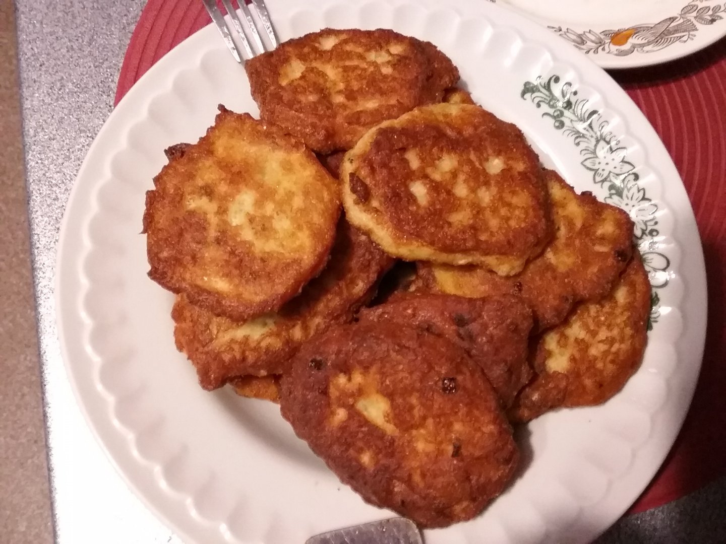 Рыбные оладушки. Две банки консер. горбуши, головка лука, два зубца чеснока, немного соли, три яйца, одна ст.ложка муки, кефир, 3/4 стакана манки. Манка и мука указана в примерном количестве. Можно подбирать по своему вкусу, но лучше меньше,чтобы рыбы побольше было. Рыбу разминаем, добавляем яйца, манку,муку, лук, чеснок и кефир. Доводим до состояния густоты, как на обычные оладьи. Жарим. Просто, недолго, вкусно.