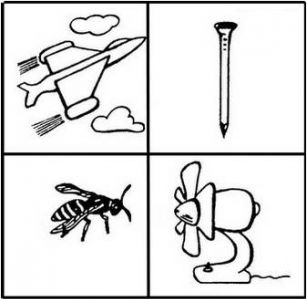один из тестов на шизофрению. По одному ответу диагноз конечно не ставится, картинок много. Но смысл ответов у шизофреников такой, они видят наличие признака, не очевидного для всех. Например: гвоздь лишний, потому что у него нет крыльев, или потому что он не може создавать ветер, а остальные могут. Или пчела лишняя, потому что она не железная и т. д.