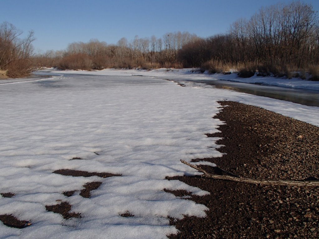 Всем привет! Читал на форуме о сборах на горную рыбалку, ну и решил сам открыть сезон. Слышал что на реке Биджан начали вскрываться плесы. Звоню родственнику, недолгие сборы и в пять утра в путь. Ехать 78 км. из них 50 по лесовозной односторонней. Нырять в сугроб пришлось всего один раз, уступал дорогу двум лесовозам. В лесу еще зима, а на марях дорога уже поплыла.