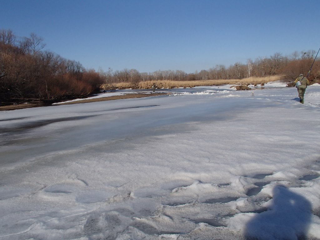 А вскрылось всего несколько плесов, основные ямы где мы рассчитывали рыбачить были еще подо льдом.