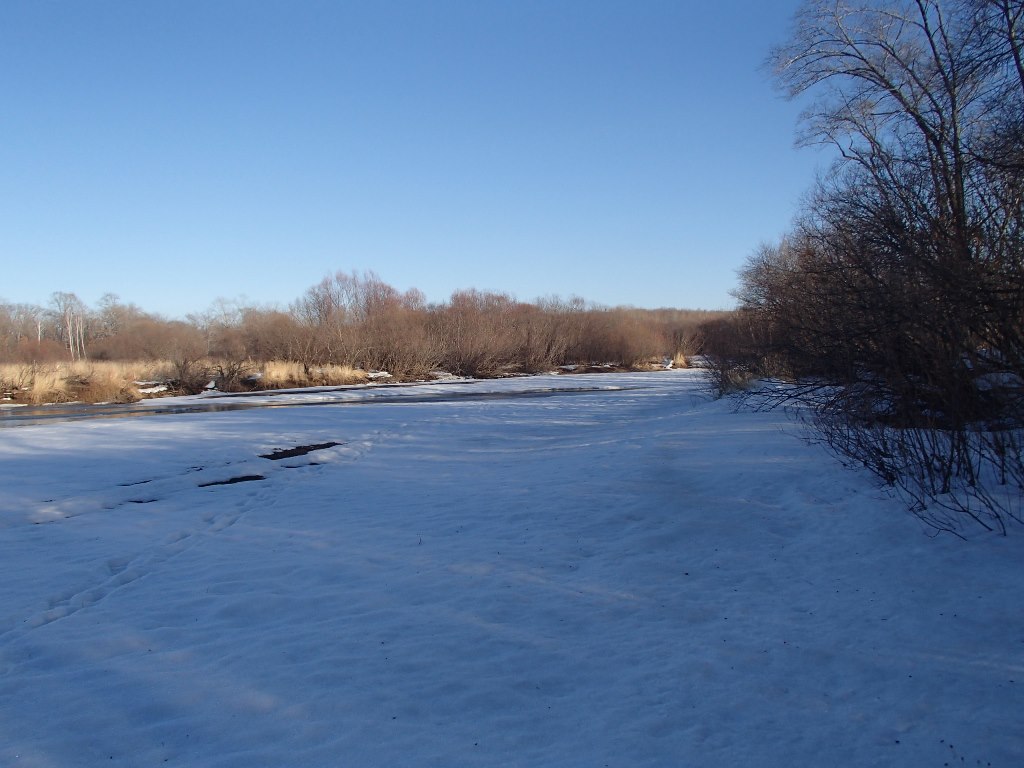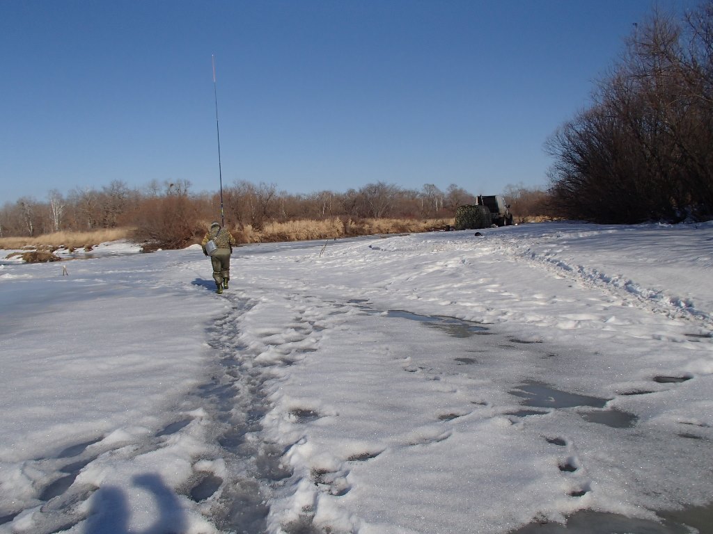 Воды в речке мало и даже после обеда вода оставалась чистой как слеза, ручьи еще не ожили, а снег на сопках еще не тает, да и немного его там. Но все же к вечеру удача улыбнулась нам, нашли мы в одном из плесов неприметную ямку, где потягали ленков. Было поймано 8 ленков, 3 по 400 грамм отпущены назад подрастать, а 5 взяты домой.