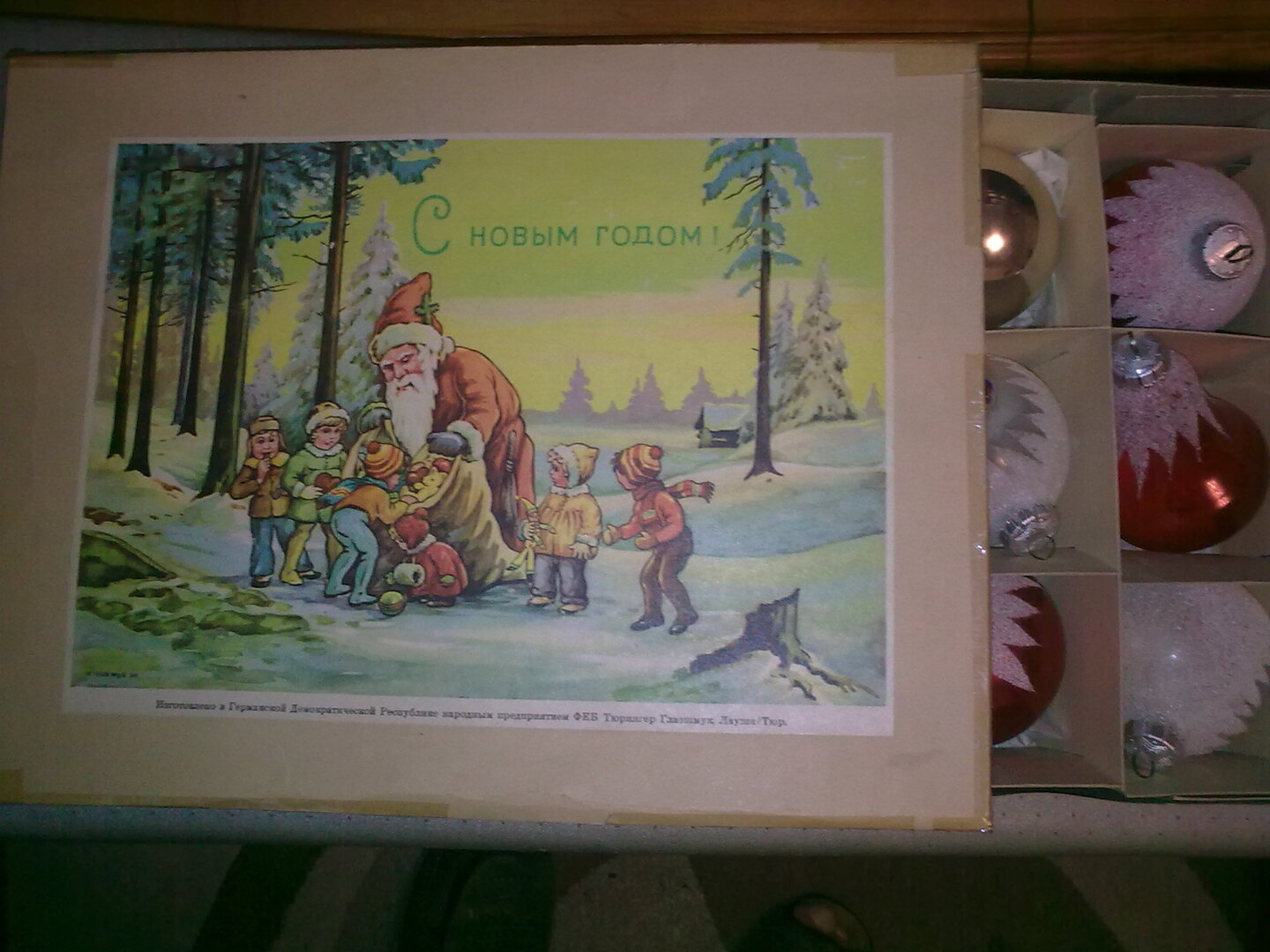 Начал сегодня разбирать свою новогоднюю ёлку (ну не до майских же её на самом деле держать! :E012:) и обратил внимание на надпись на коробке с шарами, которые нам с женой подарила моя сестра на Новый (примерно 1991-1992) год.