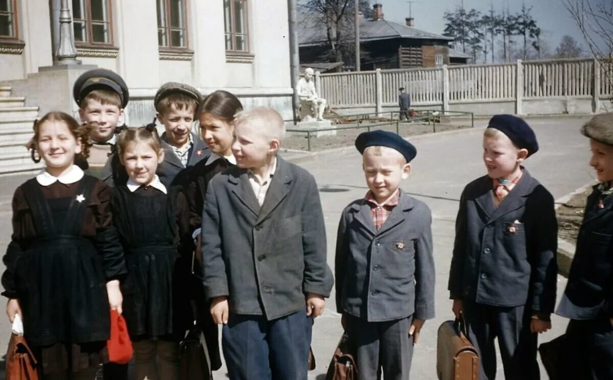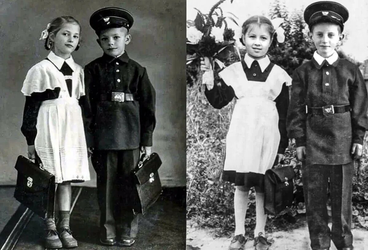 Цвет формы у мальчиков был серым. В то время в школе пользовались чернилами, поэтому все кляксы были сильно заметны на форме. В 1954г вместо серой формы, была введена синяя. Этот вид формы просуществовал до 1961г и 62-63 она была уже другой. Ремень и фуражка исчезли, появился берет. Ношение формы было обязательно в городах, в сельской местности с этим было не так строго, в основном из-за невозможности фабрик обеспечить всех школьников.