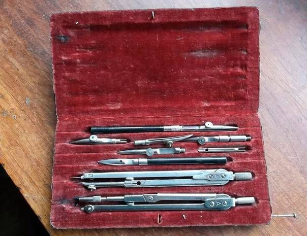 А, вот: про готовальни ещë: они были с разными циркулями. На фото - готовальня с разнобоем в комплектации. В таких готовальнях шли циркули и рейсфедеры - только полнотелые, и никакой штамповки. Это были как правило латунные инструменты, с никелированной поверхностью (это циркули, рейсфедеры были стальные). Потом появились стальные полнотелые никелированные, и на излëте этого дела - штампованные никелированные. И циркули, и рейсфедеры. Да ещë и в пластиковых кейсах (амно ломающееся). Готовальня на фото - деревянная полнотелая, на бархате, обтянутая кожей молодого дерматина, на штыревых выдвижных замках...