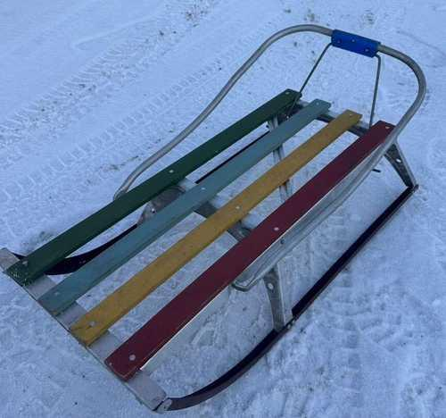 В 60х санки были полностью аллюминивые, и без развала. На фото санки 90 годов.В 60-х они были практически такие же, но без спинки и полозья леминевые. Спинку для совсем мелких родители приделывали сами.