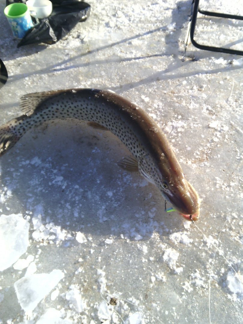 В общем час прошёл, решили чайка попить, а товарищ за открытие сезона хряпнуть. Так и сделали. Товарищ и мне в лунку плюхнул. Пока чай пил - бац, подход, да хороший такой (первый у меня в этом сезоне), тяну - щука!!! УРА!!!! Потянула на 2,800. Взяла хорошо, за 2 тройника разом. Обновил ею HIGASHIевскую удочку