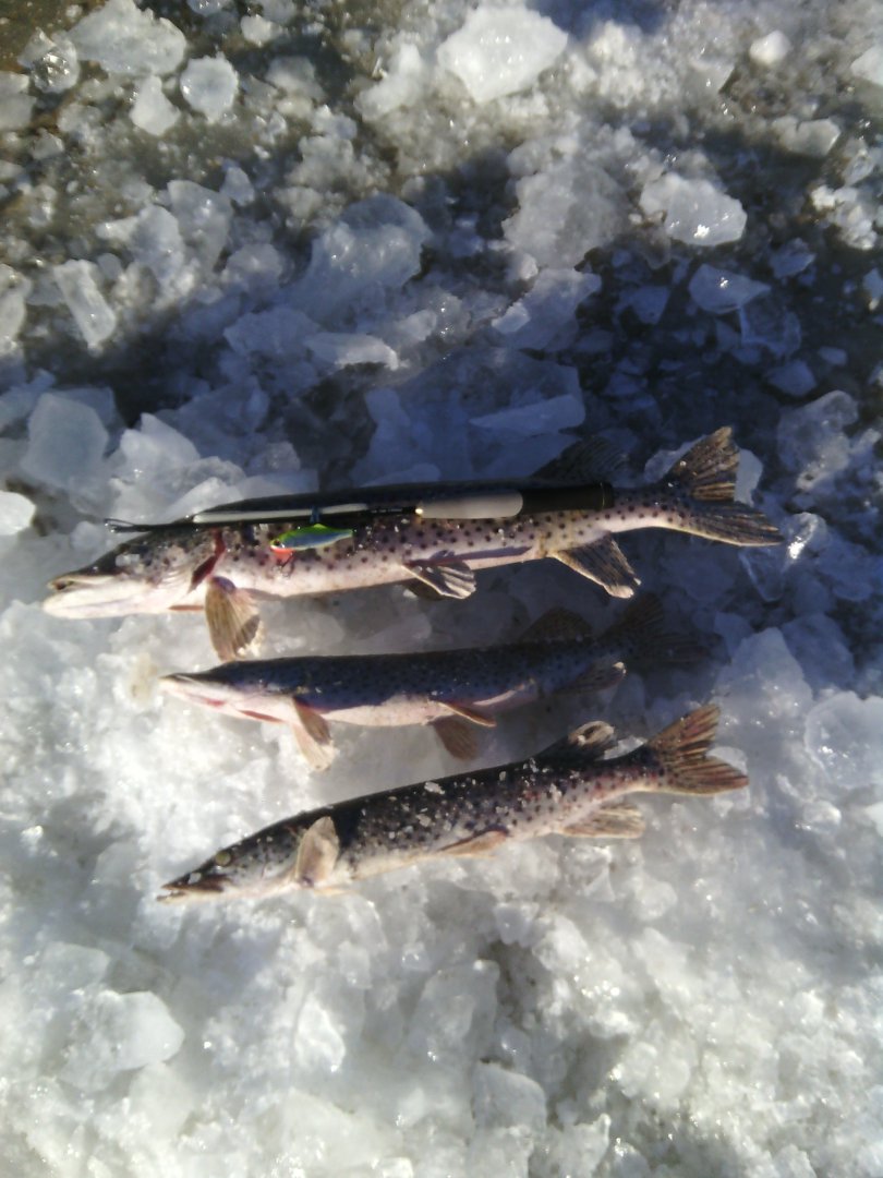 Итог рыбалки три щучки у меня. Все взяты на одного кислотного раттлина