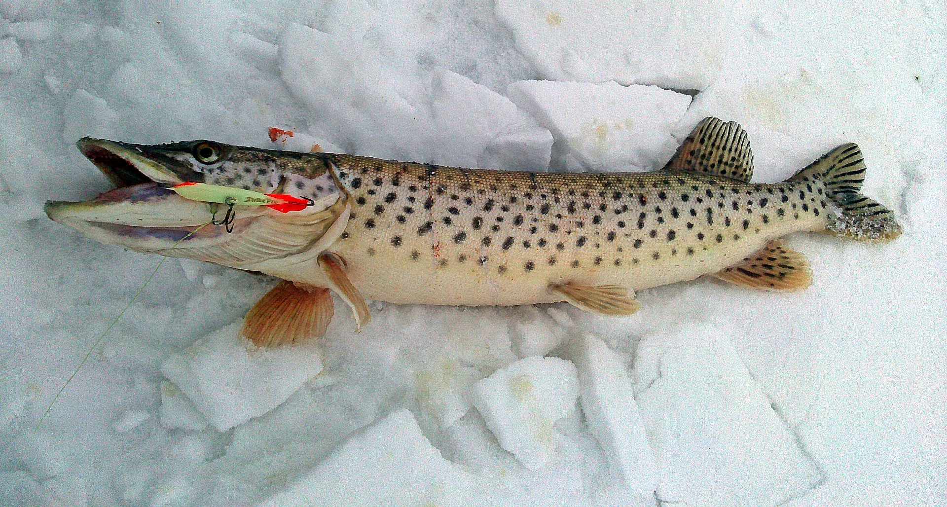 Глубина полметра , лунка 150, махалка без катушки, бегала подо льдом как угарелая. Пришлось подождать пока успокоится, потом спокойно вытянул ее на воздух, за это время она и успела сожрать хвост.