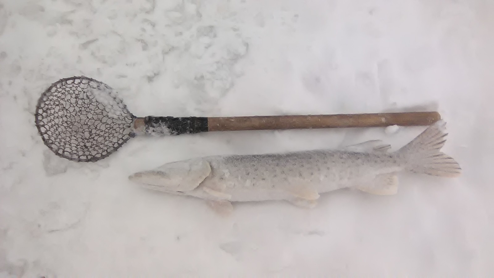 Прокатился сегодня с утра попытать счастья с товарищем по работе, он первый раз зимой на щуку ездил. Дорога наверно до самой николаевки уже пробита! Да и снег весь сдуло. Вообщем нашел старые лунки, продолбились, сели, ветрище сегодня такой что просто сдувал стульчик как только с него встаёшь, ну и естественно не дал нормально посидеть! Но все равно просидели с 9 до 12. Подходы были не часто, но всё же удалось "вымахать" одну счучку больше кило, и на каком то из подходов обломило передний крючок моему ловчему балансиру, щуку вытащил уже без него. Ну а товарищ выдернул пару шнурков, первых в его жизни хоть и не зачетных, но всё равно порадовался даже такому улову!