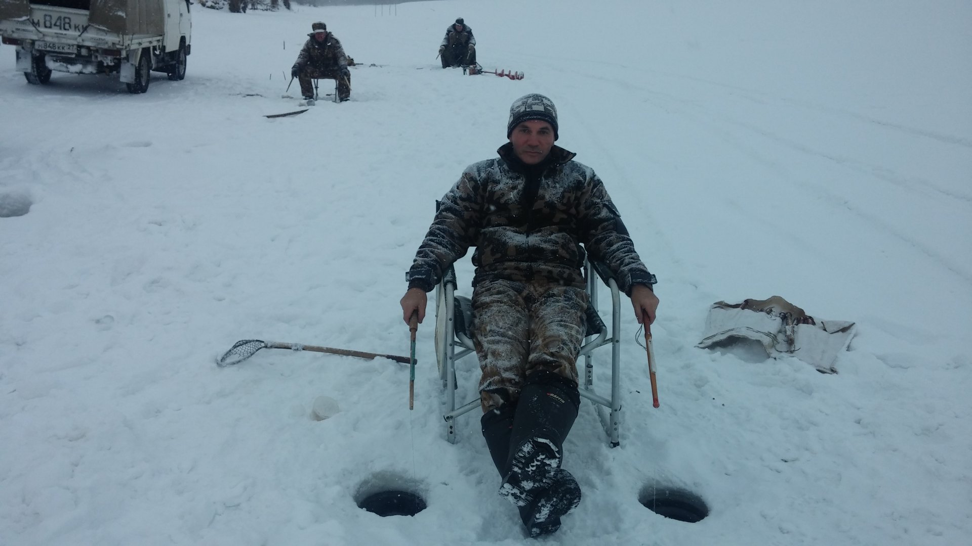 У меня шапка зимняя есть. Я просто переодеваюсь на льду.