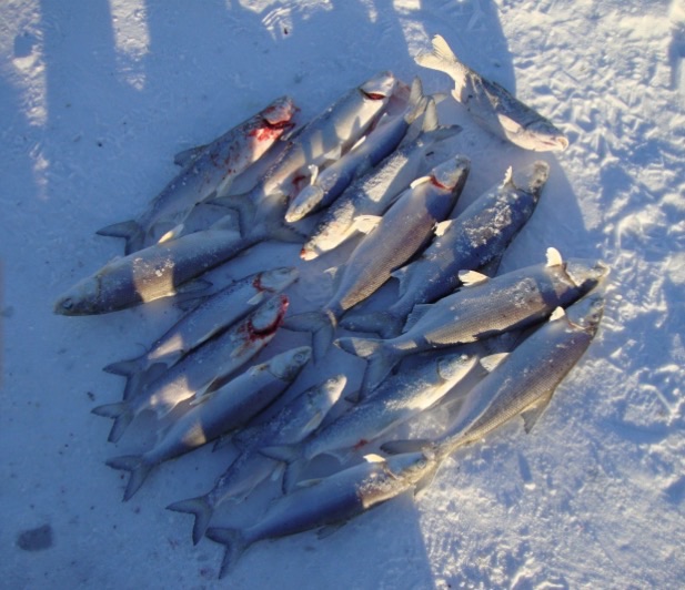 Честно говоря, даже немного устал от такой рыбалки, лунки схватываются махом, позёмкой засыпает, руки после того, как снимаешь рыбу мёрзнут до жжения, зима пришла однако. Крупного сига очень мало, в основном селёдочного размера. "Пузатая мелочь", засёкшаяся за губу, тут же немедленно топилась, около десятка, остальных с ранами пришлось забрать. Так же были три досадных схода крупных сигов, не смог завести в лунку, при вываживании бьются об лёд и начинают активно сопротивляться, забирая леску, а затем следует слабина и лёгкость на том конце...Но сколько адреналина в этот момент получаешь, достойные соперники пусть бороздят водные просторы. Под вечер, при сборе подпусков, на половине из них сидели "тихушники", часть из которых утопил, некоторых забрал. Честно говоря, сегодняшняя рыбалка самая лучшая за всю мою историю ловли сига на подпуска! Всем рыболовам удачных рыбалок а так же испытать эмоции при поклёвке достойных соперников!
