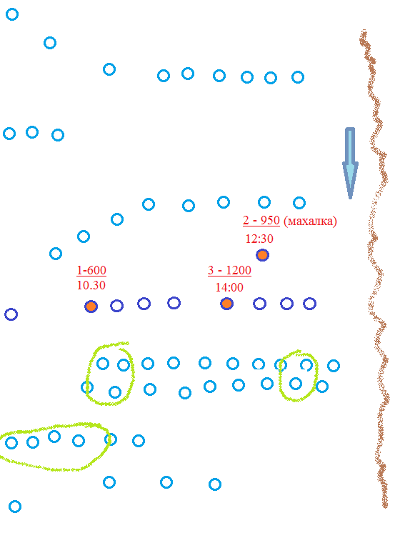 Вот схема расположения подпусков на 6 человек, ловивших на пяточке.
