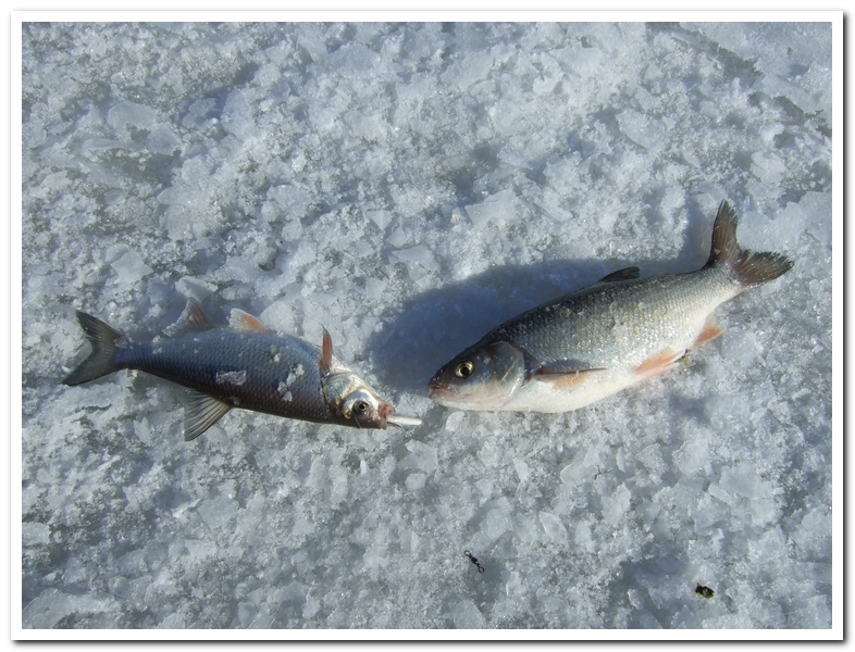 Сама рыбалка сегодня все же удалась. Четыре сига, один из которых среднего размера, три мелочь. И с десяток хороших размеров чебаков. Первые попались прямо парочкой. Так что сегодня жареной икры наелись. У соседей сегодня одни чебаки. Кстати, Василий, пришлось мне сегодня ловить на лунках в пятидесяти метрах выше наших, так как к моему приезду они уже были заняты. Но я возбухать не стал, так как свободных лунок было полно, да и человек уже устроился. Сиги у меня большей частью ловились на пятой лунке, сперва на миногу, потом на чебака. В следующий раз можно уже со спинингом приезжать.