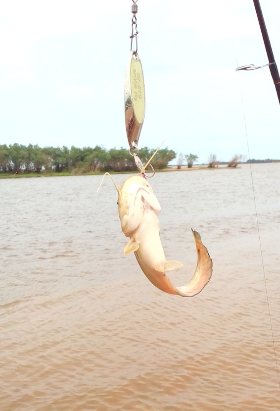 Утро отметилось безумным боем сома. Каждые 10-15 секунд по протоке слышался громовой удар с выворачиванием сомячьего хвоста. Визуально, крупного сома не было, до 5-6 килограмм. Однако видно было, что имеются в наличии и сомы очень приличных рамеров. Купание в воде на протяжении 2 часов всех имеющихся приманок позволил получить 4 выхода, причем на одну и ту же приманку. Отметил тот факт, что сом не атаковал приманку, а бил её хвостом (два выхода было в метре от берега), и выбрасывал на берег, как будто отгонял.