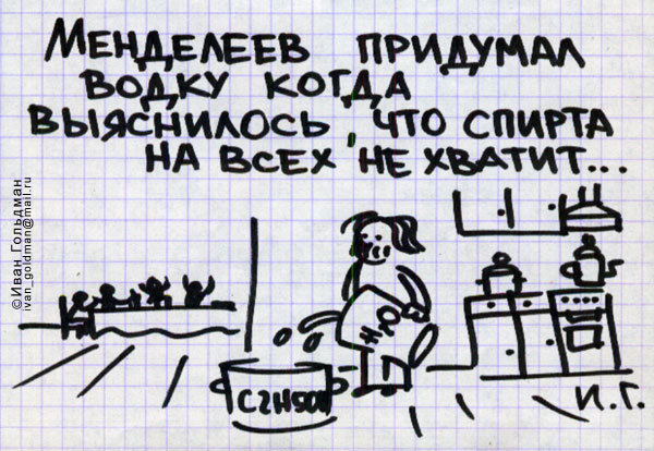 Разве это он открыл напиток из соединения спирта с водой? До этого чистый ректификат пили?Водка же - напиток из ректификата, открытый Д. И. Менделеевым 31 января 1865 года (завтра будет 158 лет как).