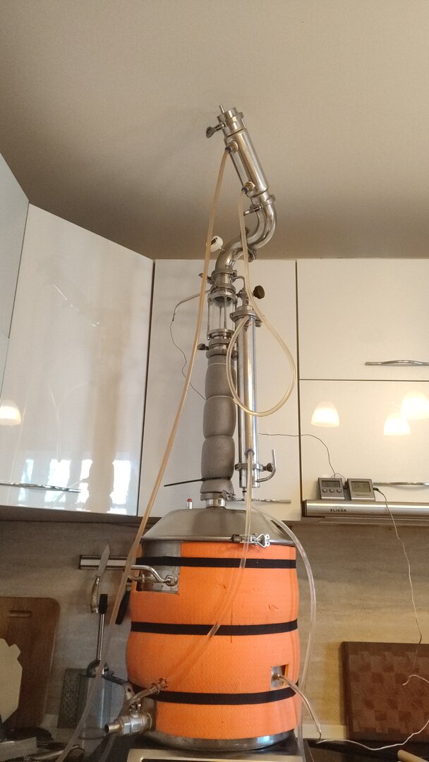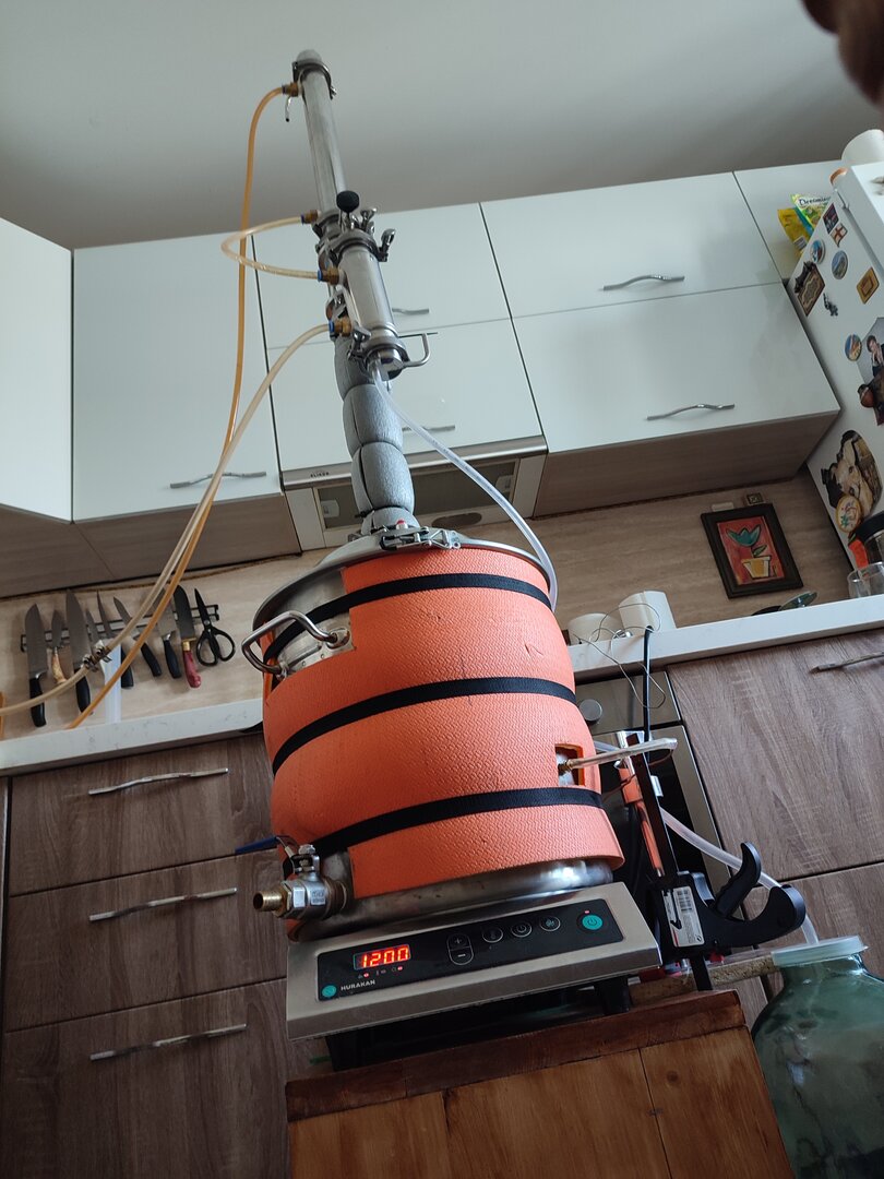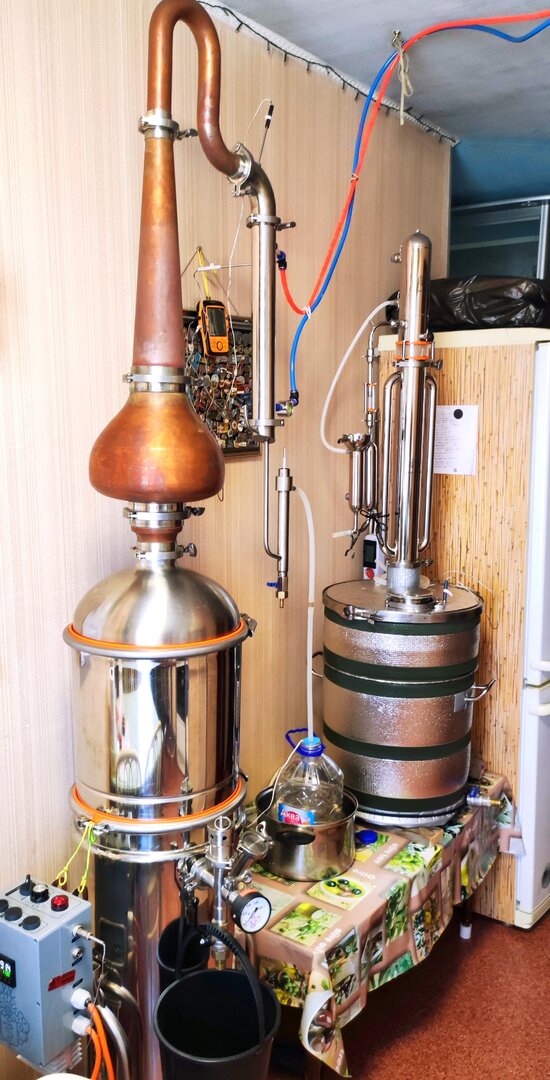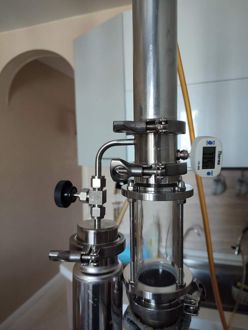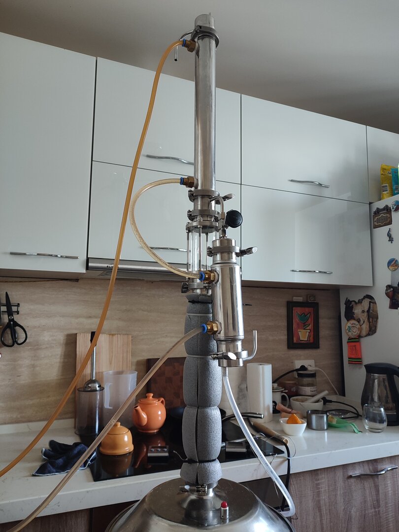 Я проверял возможности дефлегматора, доводя до захлеба колонны. Кстати так красиво кипит флегма в диоптре, что глаз не отвезти :) В общем мой дефлегматор, отлично держит даже кратковременный захлеб! Ну а процесс отбора отлажен - по мощности нагрева, подаче воды на охлаждение и скорости отбора. Все ок!