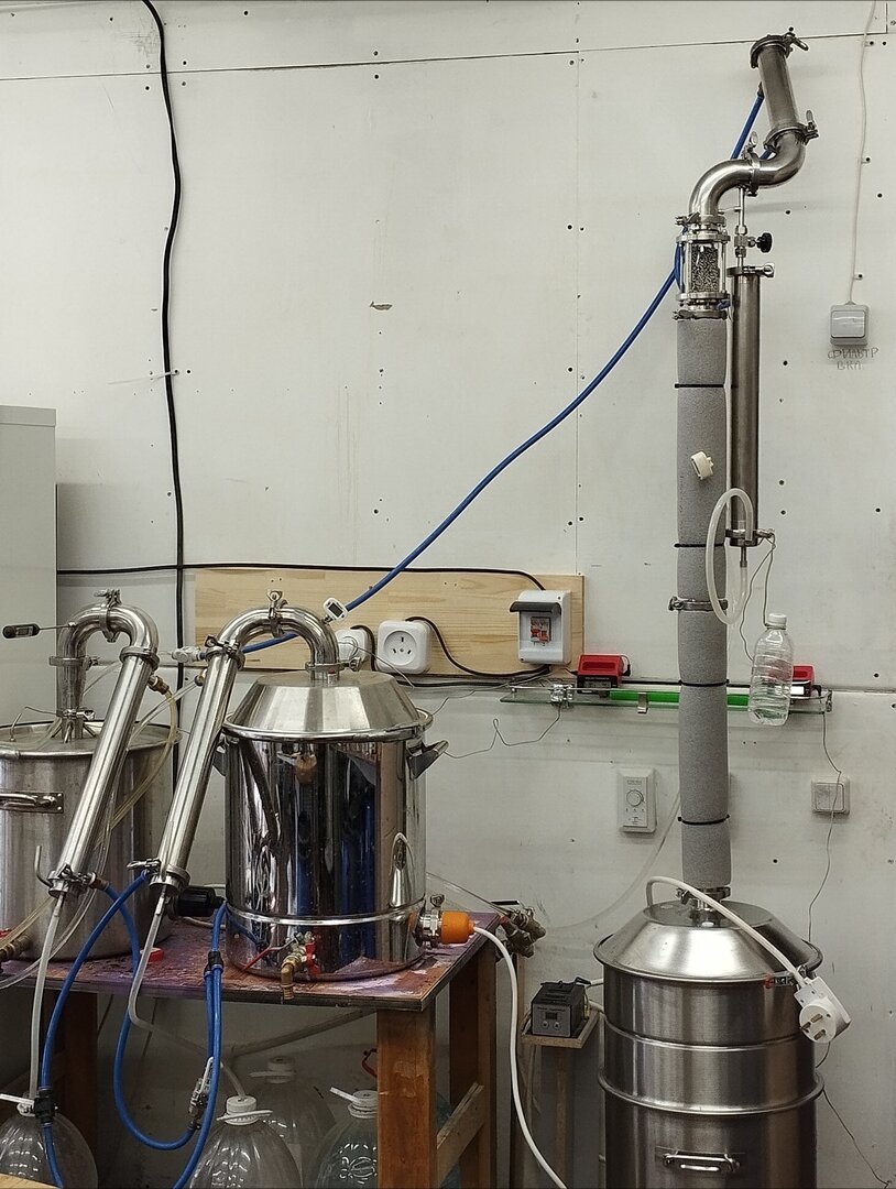 Слева двойной пулеметный расчет, для быстрой перегонки браги в спирт/сырец. Справа каланча, которая вытягивает из спирта сырца, чистейший продукт 96° :)