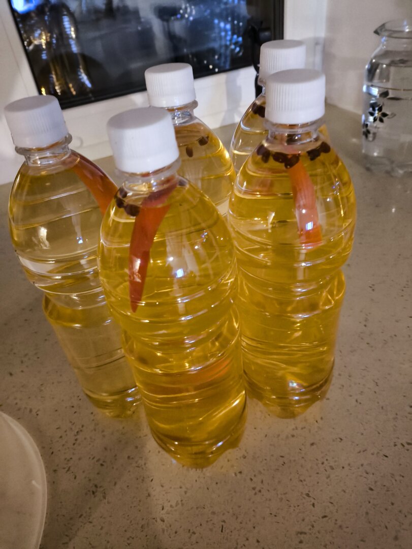 Разлил по бутылкам в стекло. В каждую бутылку по острой перчинке. Перчики от Сереги (Rak1978).