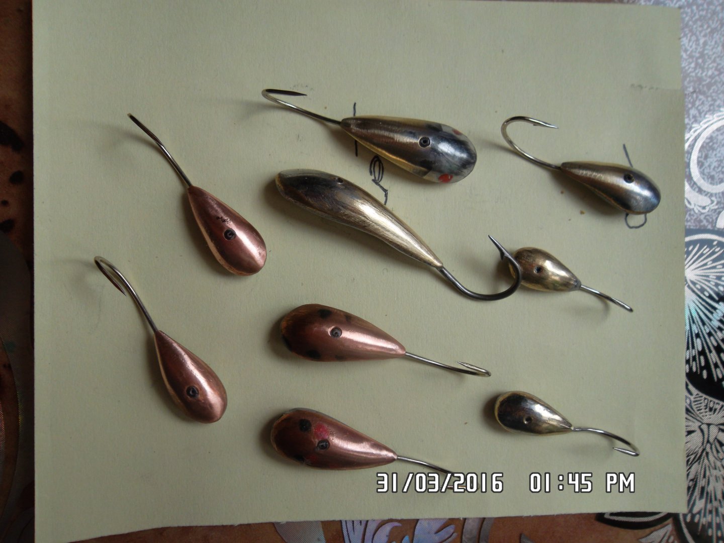 Эти остались с перволедья и начала зимы. Размораживать полностью не стал,еще сгодятся. Ориентировочно гр. с 200 до 1,5 кг. Если есть надежда на более крупную рыбу,мормышки несколько мощнее,ну а если ваще,можно и парочку тампонов и 3.см. мормышку с гаком 10 (рус).