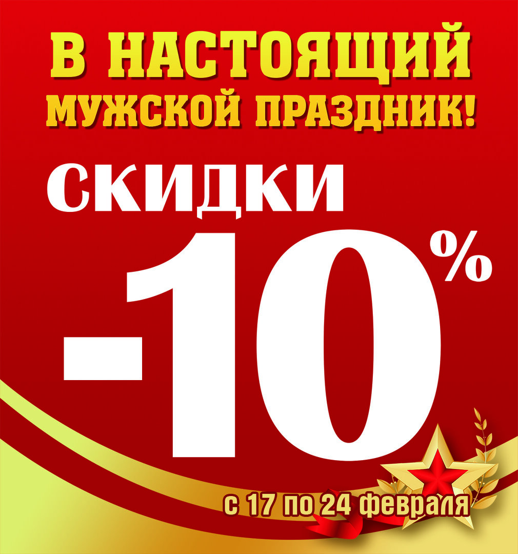 В честь праздника мы объявляем неделю скидок -10% на широкий ассортимент продукции:
